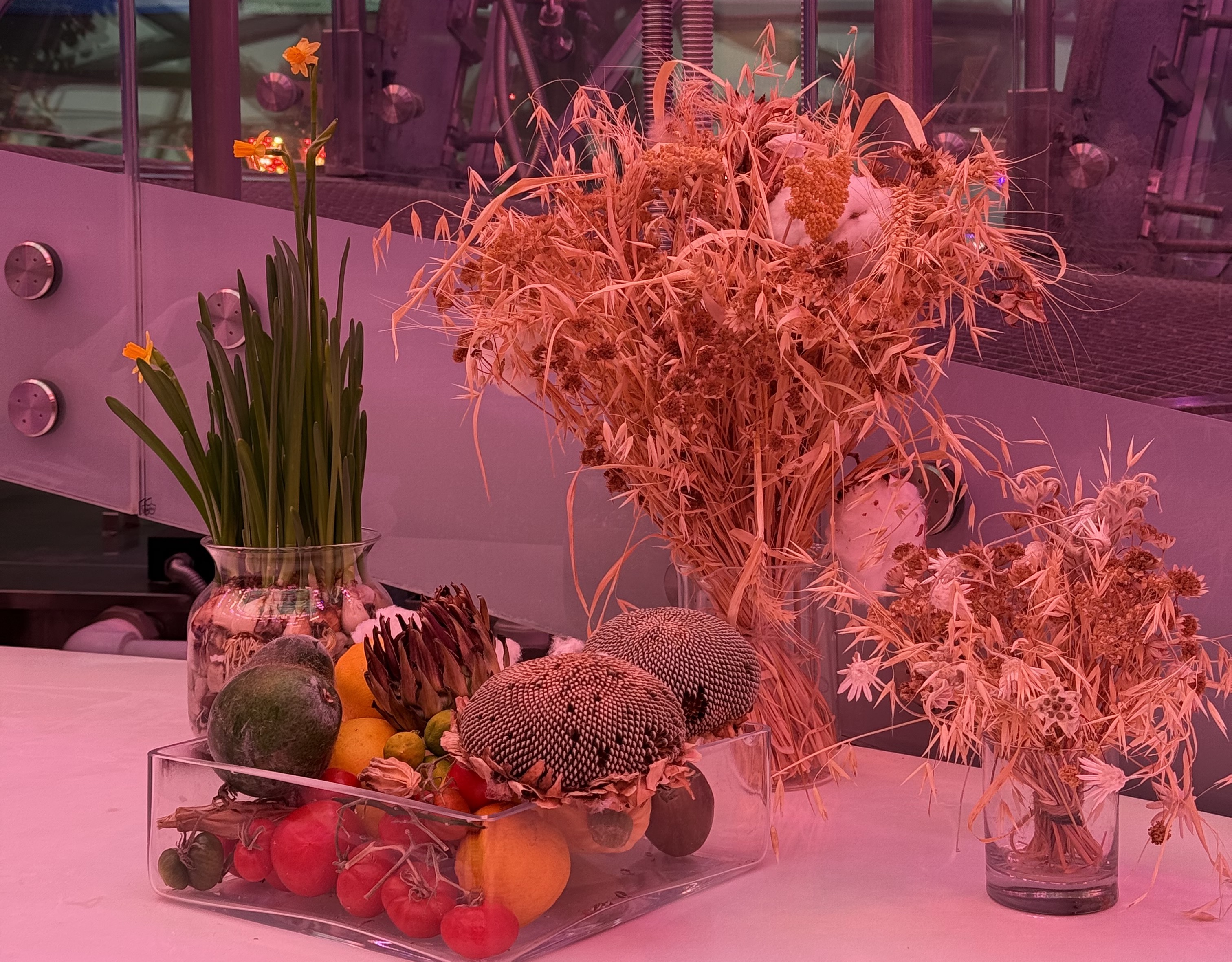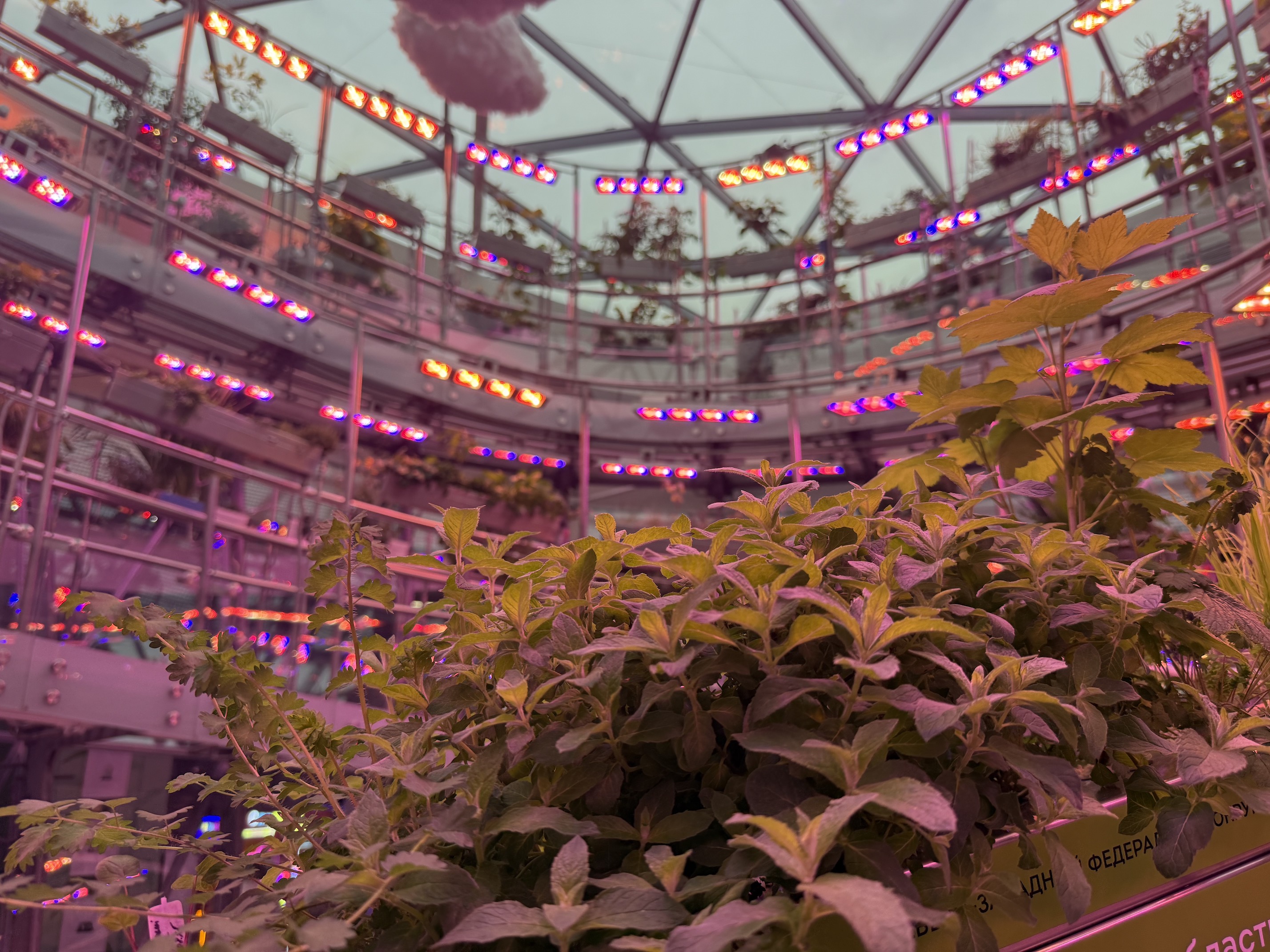 Главное чудо флорариума в том, что все эти растения — от скромной земляники до внушительного лимона — растут без почвы. Технология аэропоники доставляет питательные вещества прямо к корням в виде мелкодисперсного аэрозоля. Благодаря этому экспонаты не просто зеленеют, а регулярно цветут и плодоносят. Сотрудники флорариума даже опыляют растения вручную — маленькими кисточками, заменяя отсутствующих пчёл. А в центре экспозиции часто можно увидеть натюрморты из собранного урожая: выращенные здесь же подсолнухи, лимоны, тыквы, арбузы и момордику — всё это можно рассмотреть вблизи и сфотографировать.