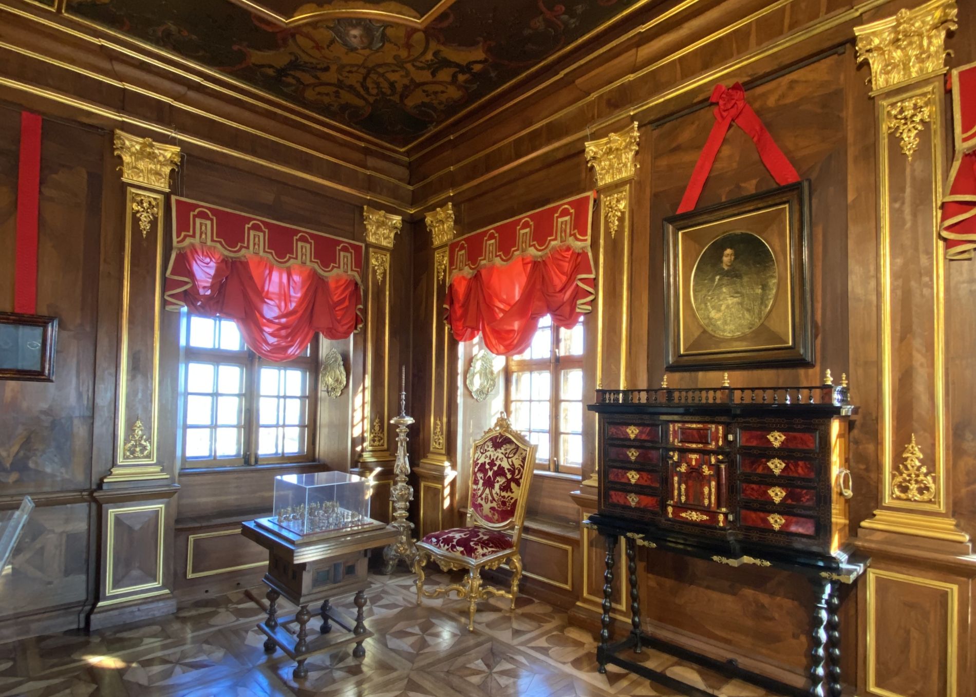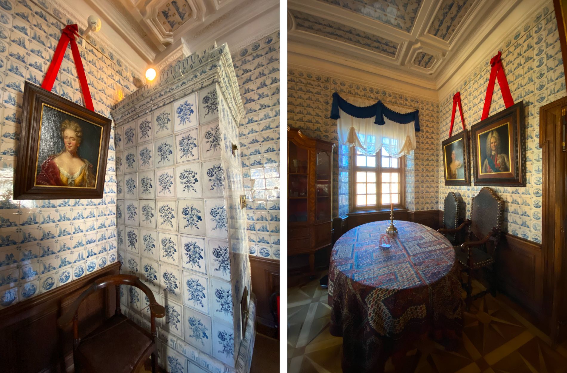 Внутри сохранились исторические интерьеры с изразцовой облицовкой стен, голландскими печами, деревянными резными панно с инкрустацией. Одна из самых выразительных комнат — Ореховый кабинет с наборными панно из дерева.