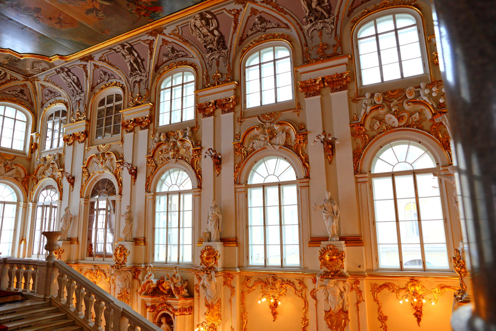 Впрочем, в Эрмитаже впечатляют не только картины, но и роскошные интерьеры. В парадную анфиладу залов поднимаются по Иорданской лестнице, украшенной скульптурами, золочёной лепниной и росписью. Внимания заслуживают также Большой и Малый Тронный залы, Малахитовая гостиная, Павильонный зал с часами «Павлин» и Лоджии Рафаэля, повторяющие росписи Ватиканского дворца.