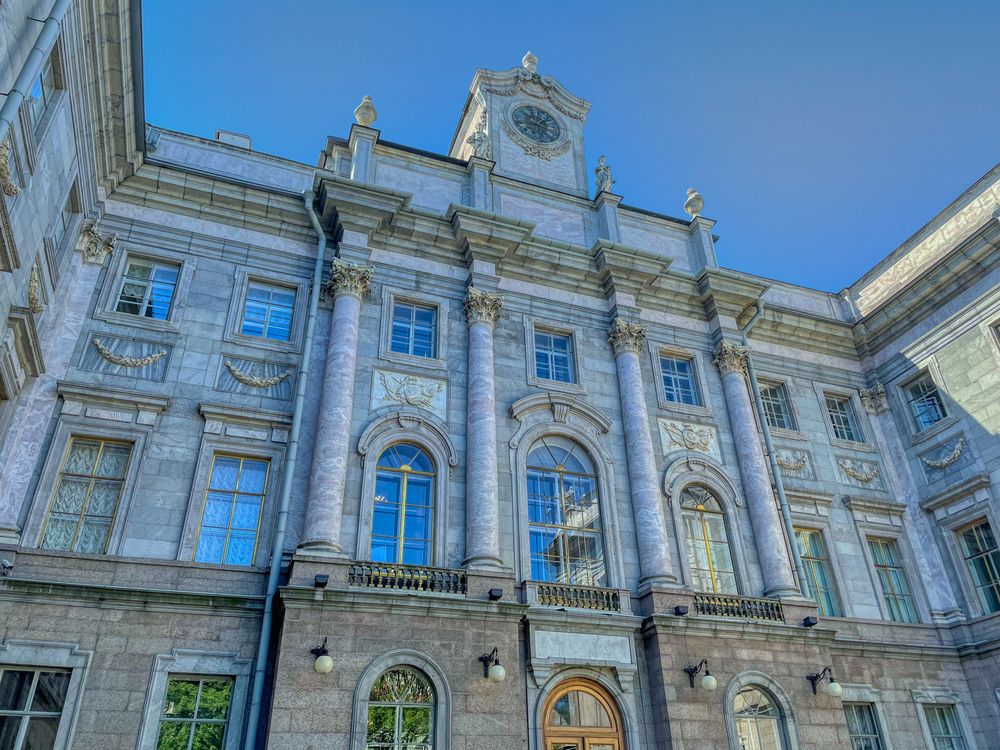 Кстати, фасад дворца не всегда был бирюзовым. На момент завершения строительства здание было тёпло-охристым, затем стало золотистым, при Николае II — кирпично-красным, а после розоватым. В советские годы дворец сделали оранжевым, но вскоре снова перекрасили. Бирюзовым здание стало в 1947 году — и с тех пор цвет не менялся.