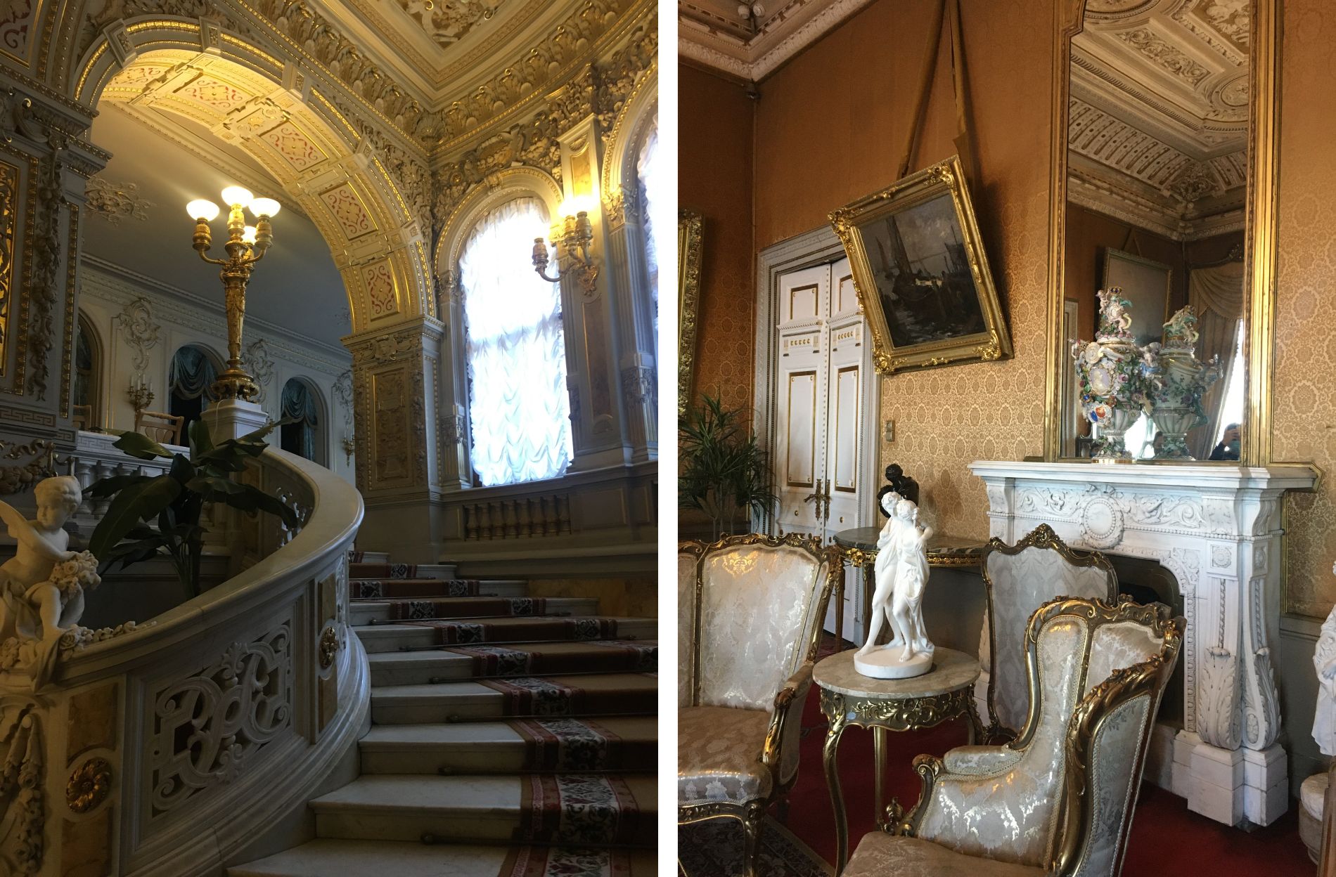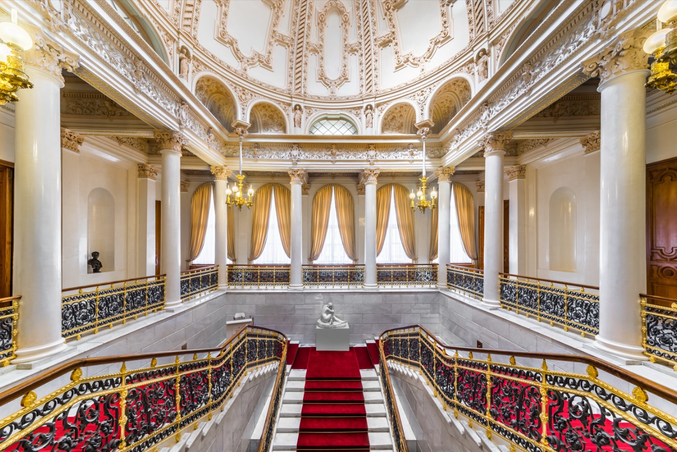 Интерьеры тоже производят сильное впечатление. Главное украшение дома — парадная лестница с колоннами, облицованная мрамором и обильно декорированная лепниной. Также интересно осмотреть пышно обустроенные Золотую, Синюю и Красные гостиные.