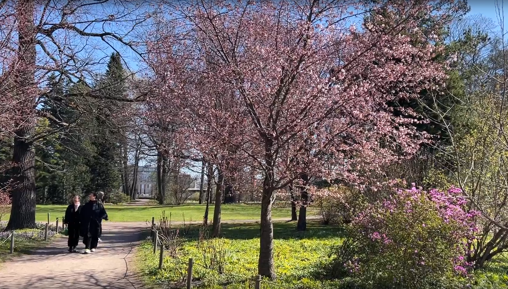 В 2026 году первые бутоны сакуры распустились здесь 21 апреля. Пик цветения сотрудники Ботанического сада ожидают в выходные, 25 и 26 апреля. Когда придёте сюда, ищите вишни в Японском саду, на аллее сакуры вдоль Длинного пруда, у памятника Петру Великому.